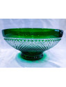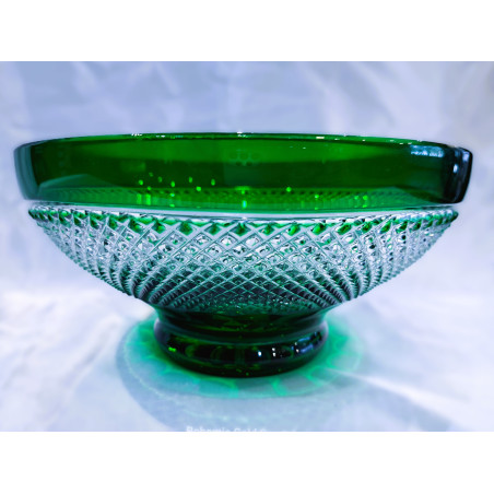 Krásná skleněná mísa, přejímané sklo v zeleném provedení o průměru přibližně 25 cm v nejširším bodě. Jedná se o dvouvrstvé sklo. Vhodná jako dekorativní sklo, lze využít také na ovoce. Výjimečná je zejména svým tvarem a stylem brusu. Originální a jedinečný kousek.