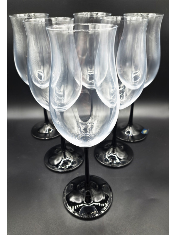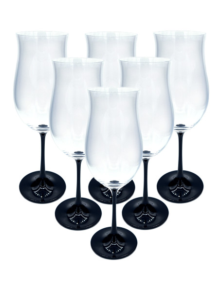 Sklenice z kolekce Ellen z tenkého skla s moderním černou nožičkou. Objem sklenic činí 360 ml, sada obsahuje šest kusů. V dostání také s červenou nožkou i barevným kalichem.