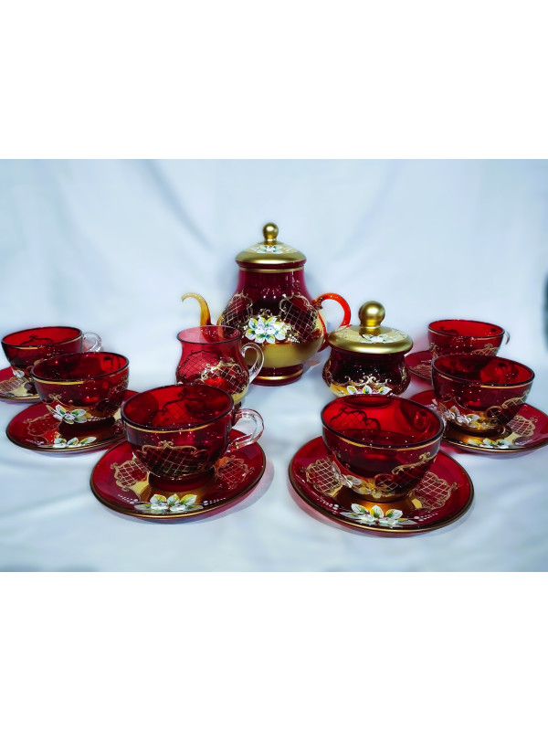Luxusní červená čajová smaltová souprava, zdobená zlatem. Balení obsahuje 6 kusů talířků, 6 kusů hrníčků, konvičku, mlíčenku a cukřenku. Vhodný jako ozdoba svátečního stolu.