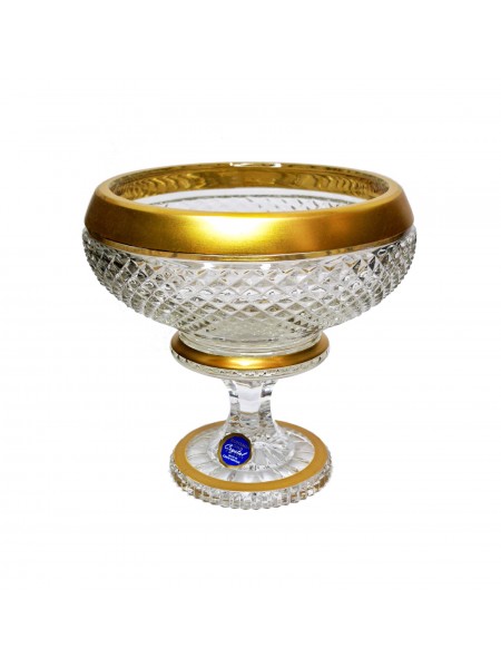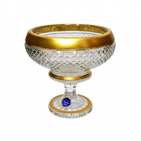 Nástolec (= mísa na noze) zdobená brusem špičtajn, nanášeným zlatem a zlatou lištou s kostkami. Velikost mísy je 30,5 cm. K dostání v několika velikostech.