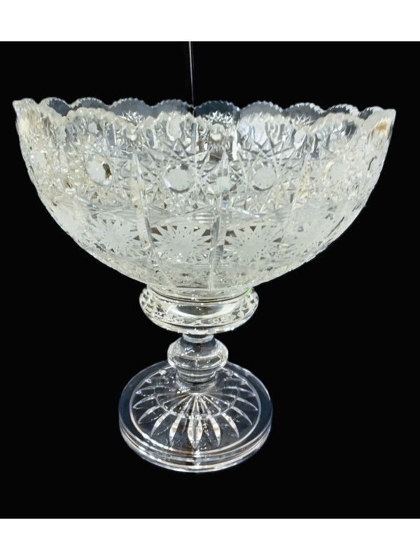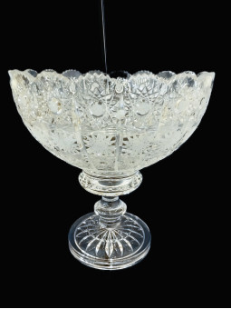 Kulatá otevřená, hluboká mísa s dýnkem, na noze, broušená vzorem 57001. Mísa má průměr 25 cm.
