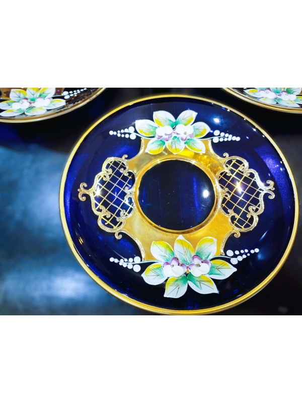Čajové skleničky Venezia s talířky modré barvy, zlato a smalt 6 + 6 ks