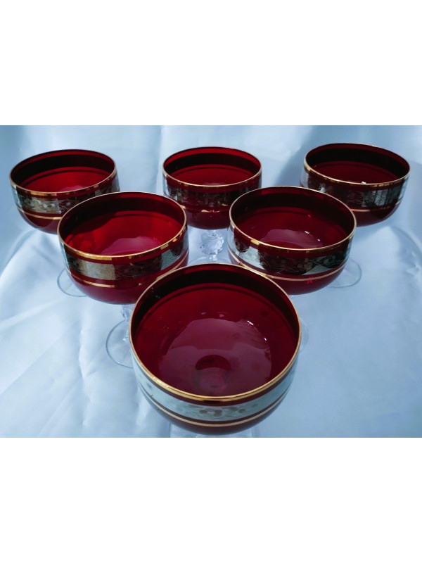 Sada šesti sklenic na šampaňské o objemu 200 ml. Sklenice zdobí studené barvy a platina s jemnými ornamenty. Nabízíme tři barevné varianty (zelená, červená, modrá).