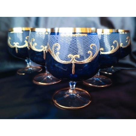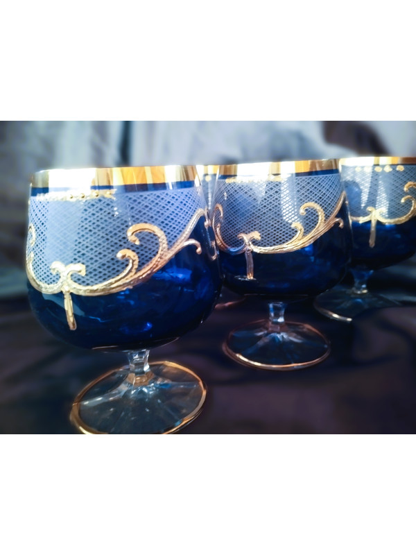 Modré sklenice na brandy se zlatým motivem 250 ml, 6 ks