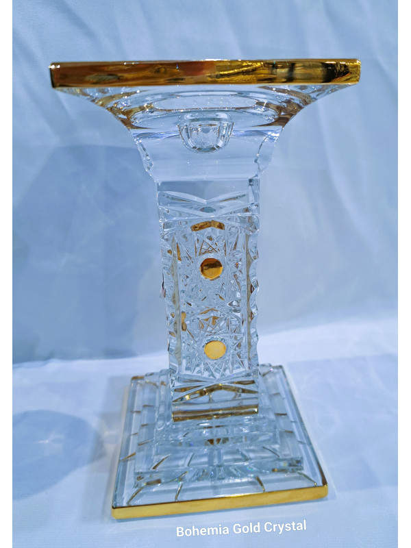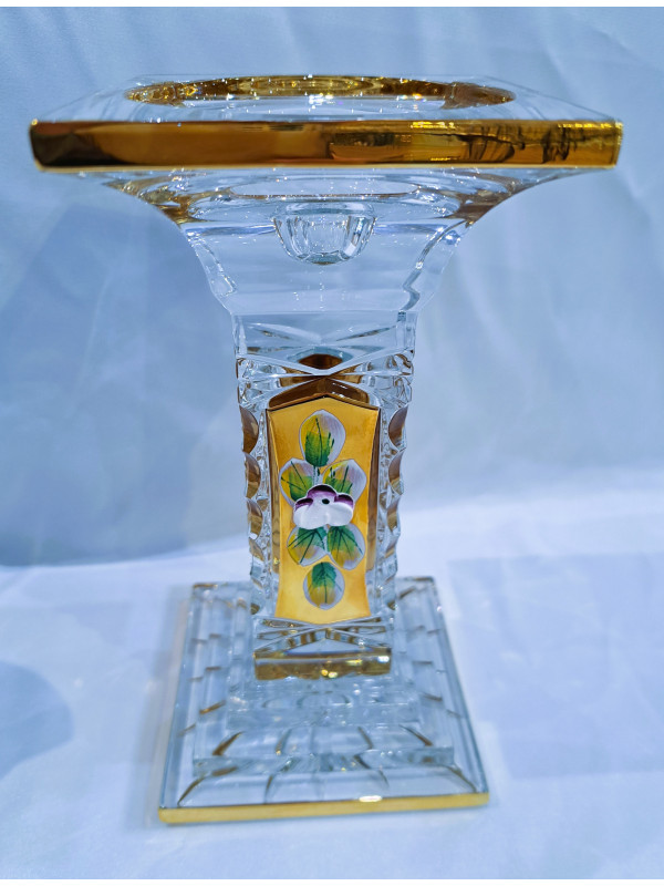 Hranatý, mohutný svícen se zlatem a smaltem. Výška je 17 cm. Jedná se o dekorativní zboží, které nesmí do myčky.