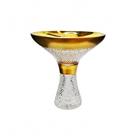 Velká váza ve tvaru tzv. Tanečnice, zdobená brusem bodlinek, tzv. špičtajn, a nanášeným zlatem. Tento dekor je velmi oblíbený zejména v zahraničí. Váza má výšku 25,5 cm.