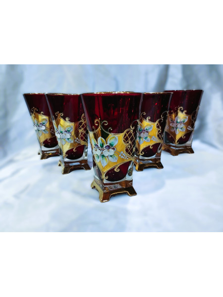Reich verzierte rote Teetassen mit einem Fassungsvermögen von 175 ml. Die Tassen sind handdekoriert mit Emaille und Gold. Das Set besteht aus sechs Tassen. Die Tassen sind nicht spülmaschinengeeignet.