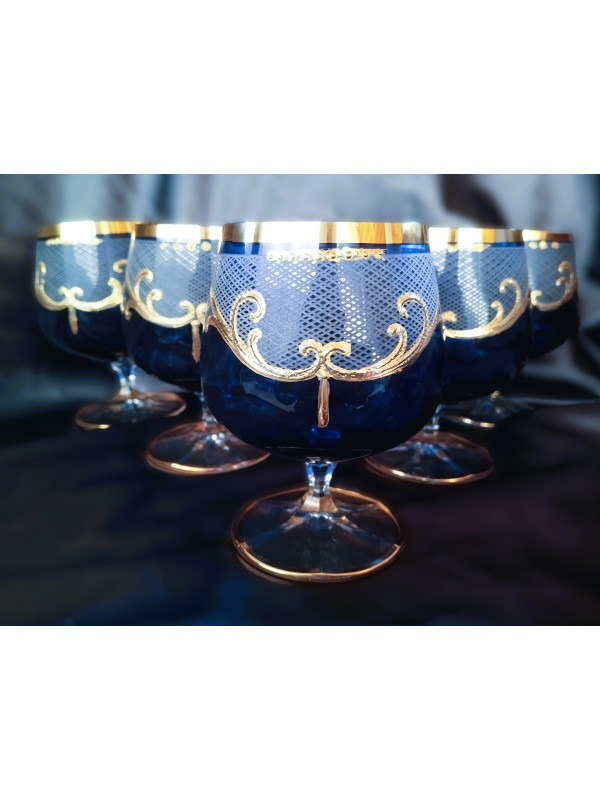 Blaue Brandygläser mit Golddekor, 250 ml, 6 Stück.