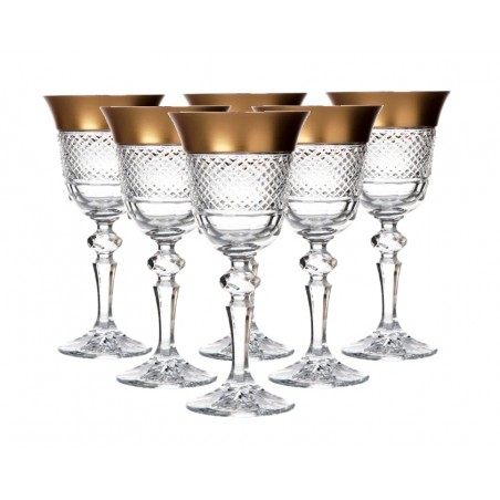 Weingläser im Dekor Špičtajn (Gold und geschliffene "Disteln") aus der Kollektion Laura. Die Gläser sind handdekoriert, geschliffen und haben ein Volumen von 170 ml. Das Set enthält sechs Teile.