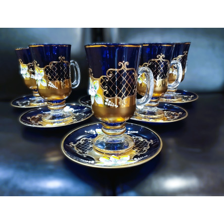 Teegläser Venezia mit Untertassen Blau, Gold und Emaille 6 + 6 Stück