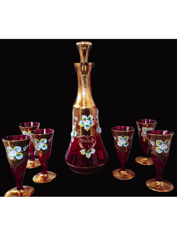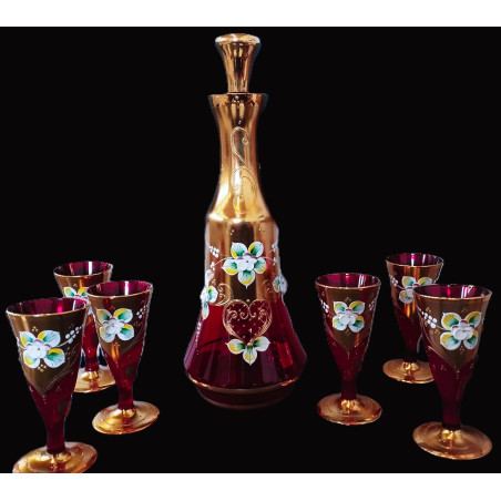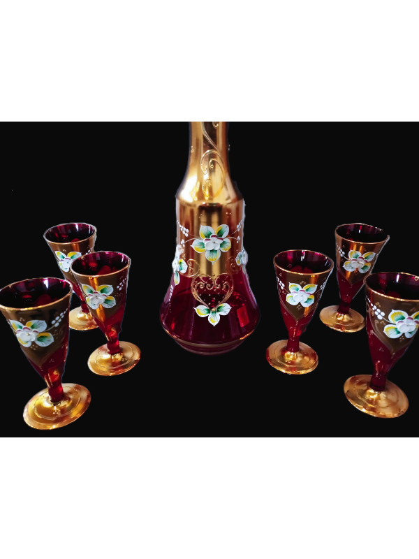 Vergoldetes rotes Likörglas-Set 6+1 mit Emaille verziert