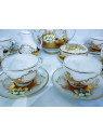 Luxuriöses, weiß emailliertes Teeservice mit Goldverzierungen. Das Set enthält 6 Teller, 6 Tassen, eine Teekanne, ein Milchkännchen und eine Zuckerdose. Ideal als Dekoration für eine festlich gedeckte Tafel.