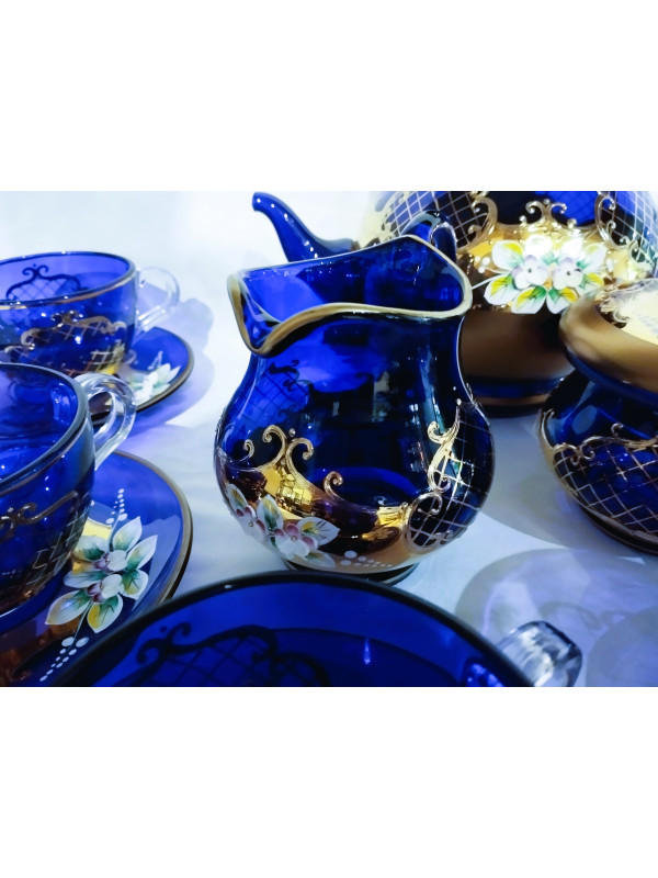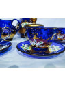 Luxuriöses, blau emailliertes Teeservice mit Goldverzierungen. Das Set enthält 6 Teller, 6 Tassen, eine Teekanne, ein Milchkännchen und eine Zuckerdose. Ideal als Dekoration für eine festlich gedeckte Tafel.