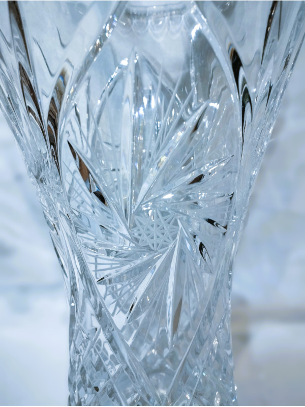 Geschnittene Vase „X“ 28 cm. Die Vase ist mit einem klassischen „Windmühlen“-Dekor poliert. Sie können aus einer großen Auswahl an klarem oder dekoriertem Glas wählen.