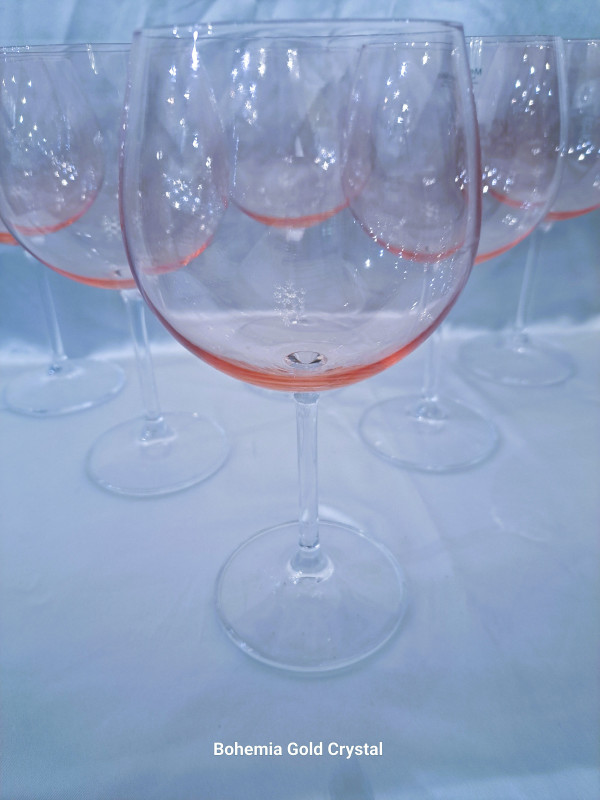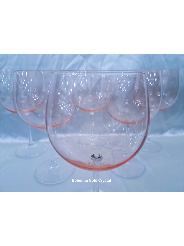 Pink wine glasses with a volume of 300 ml. Very modern and elegant. Colored glass in combination with a clear leg has recently become a trend. Suitable as a gift.