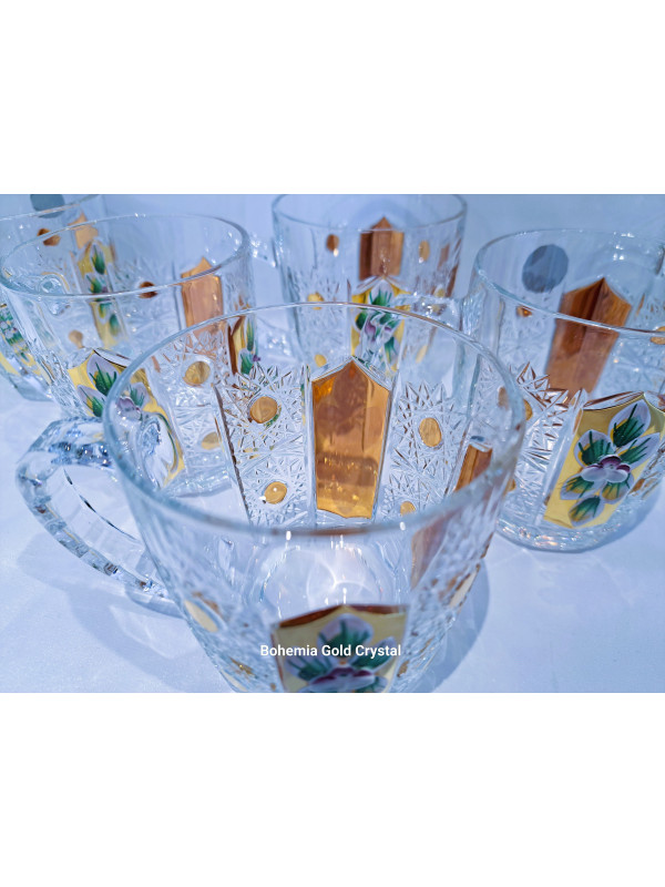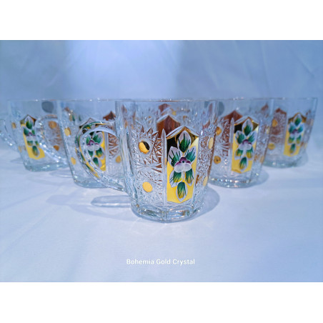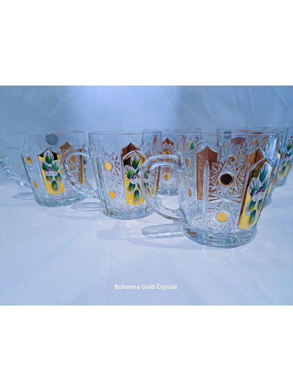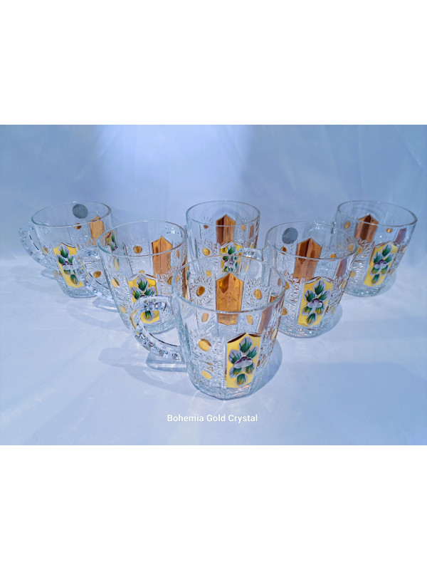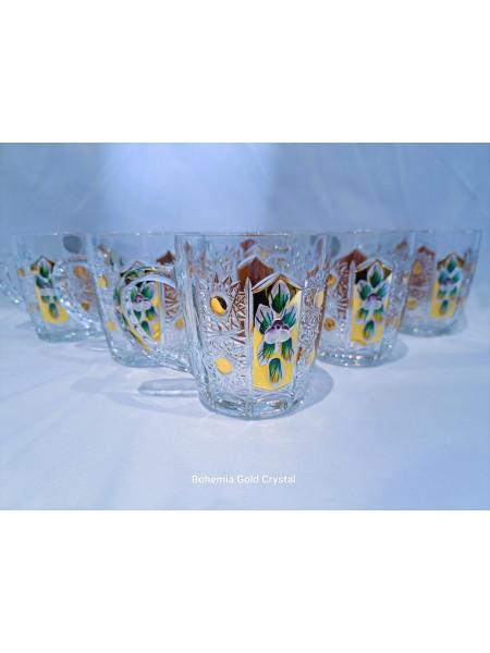 Richly decorated coffee and tea mugs with an ear in decor 57110. The mugs are hand-decorated with enamel and gold. The volume is 180 ml. The set contains six mugs. Mugs are not dishwasher safe.