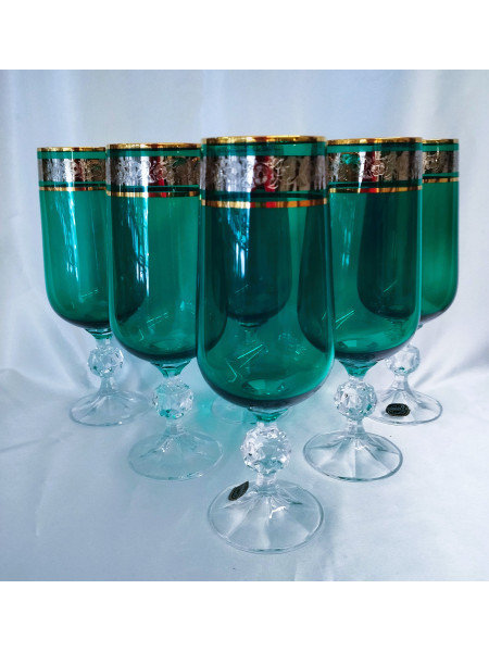 Set of six glasses for water, beer with a volume of 290 ml. The glasses are decorated with cold colors and platinum with fine ornaments. We offer three color variants (green, red, blue).
