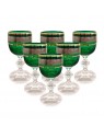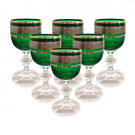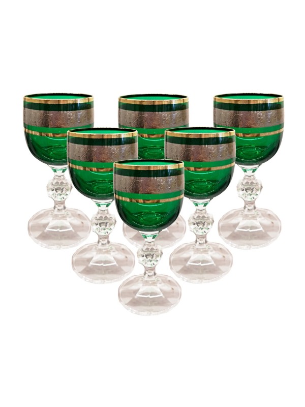 Small glasses on a leg designed for drinking vodka or liqueur. The volume is 50 ml. The glasses are from the Claudia collection in a green design decorated with a platinum stripe with ornaments. The set contains six pieces. Also available in other colors.