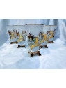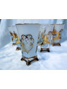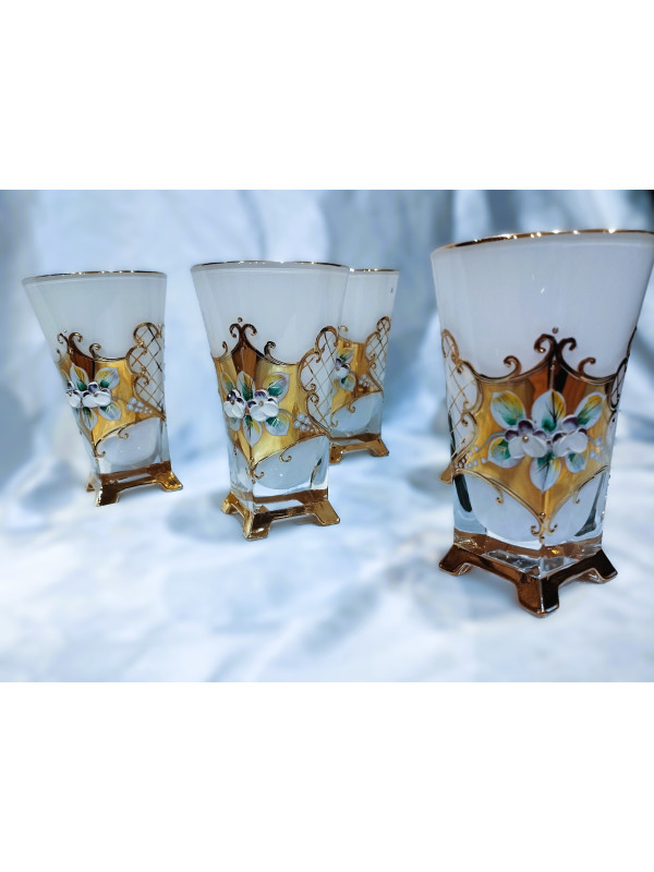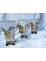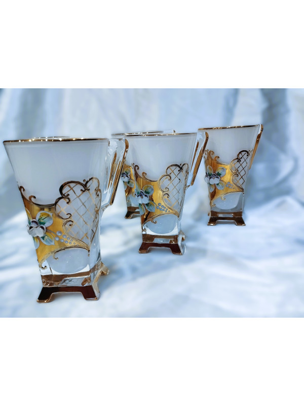 Richly decorated white tea mugs with a capacity of 175 ml. The mugs are hand decorated with enamel and gold. The set contains six mugs. The mugs are not dishwasher safe.