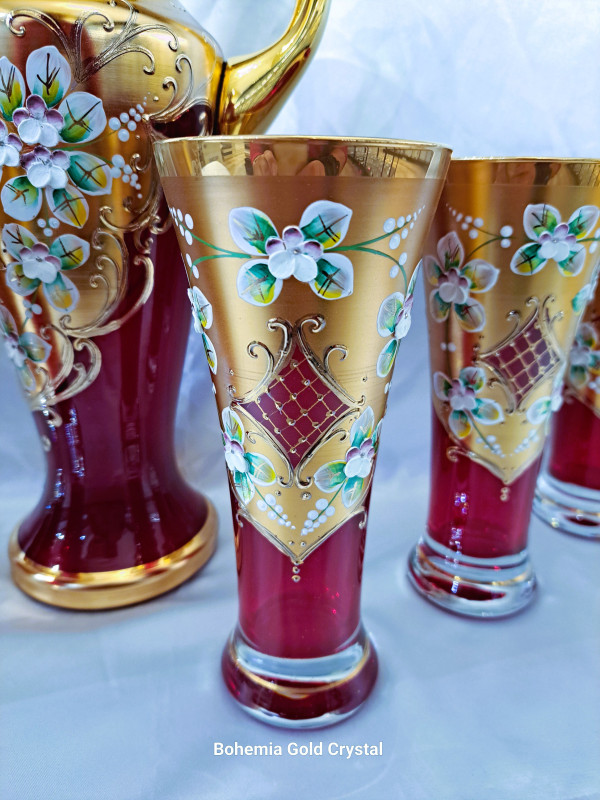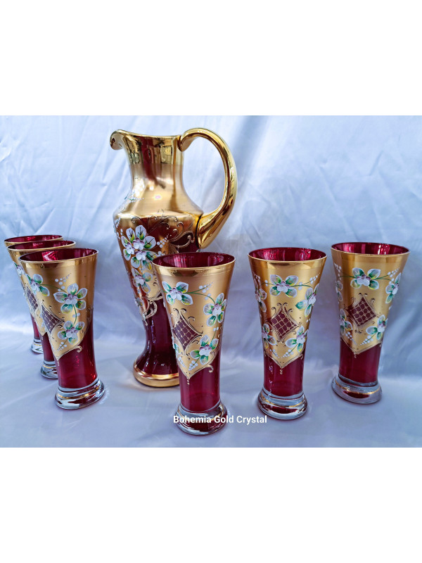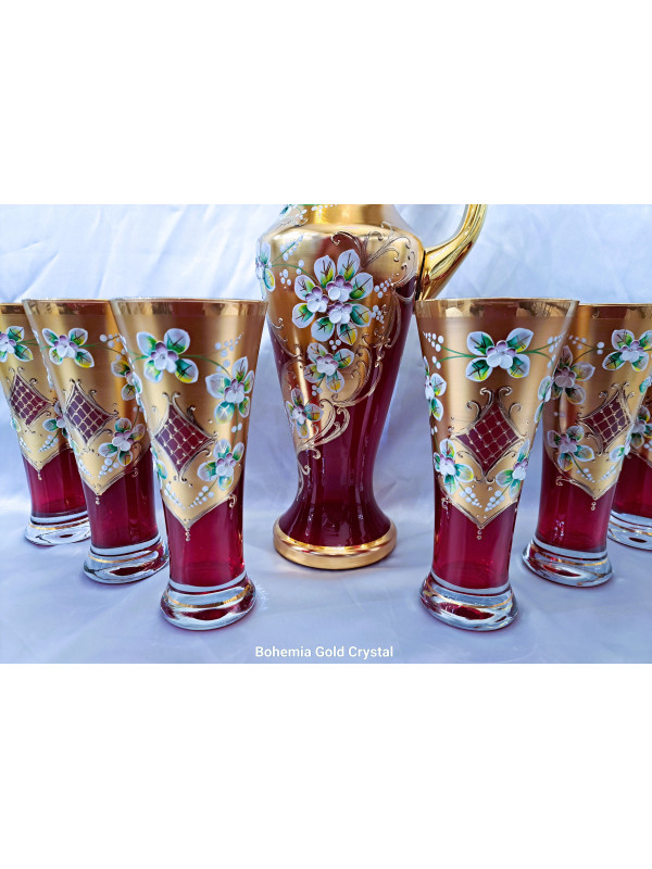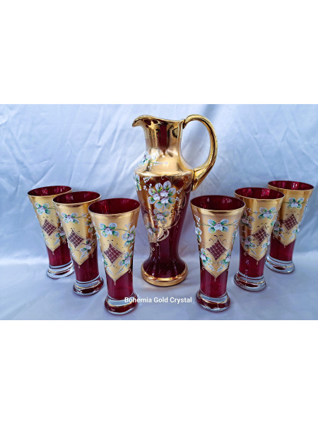 A very nice green set decorated with gold and enamel leaves. It is handmade and a truly original piece. The height of the jug is 36 cm, the height of the glasses is 22 cm. Only a limited number of pieces available and they will be gone! Ideal as a gift for lovers of Czech glass.