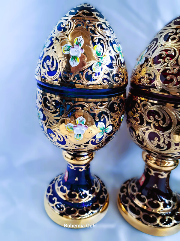Beautiful glass jars in the shape of an egg, decorated with gold and enamel. Masterful and precise work. Last pieces in stock. This decor is very difficult to produce and will no longer be available.