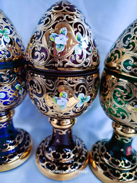 Beautiful glass jars in the shape of an egg, decorated with gold and enamel. Masterful and precise work. Last pieces in stock. This decor is very difficult to produce and will no longer be available.