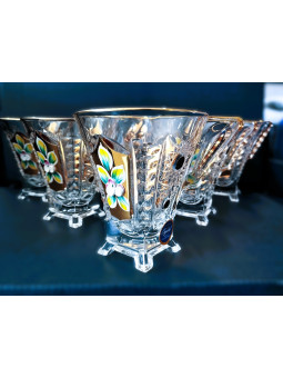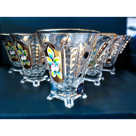 Richly decorated tea mugs with a capacity of 150 ml. The mugs are hand-decorated with enamel and gold. The set contains six mugs. The mugs are not dishwasher safe.