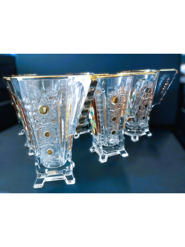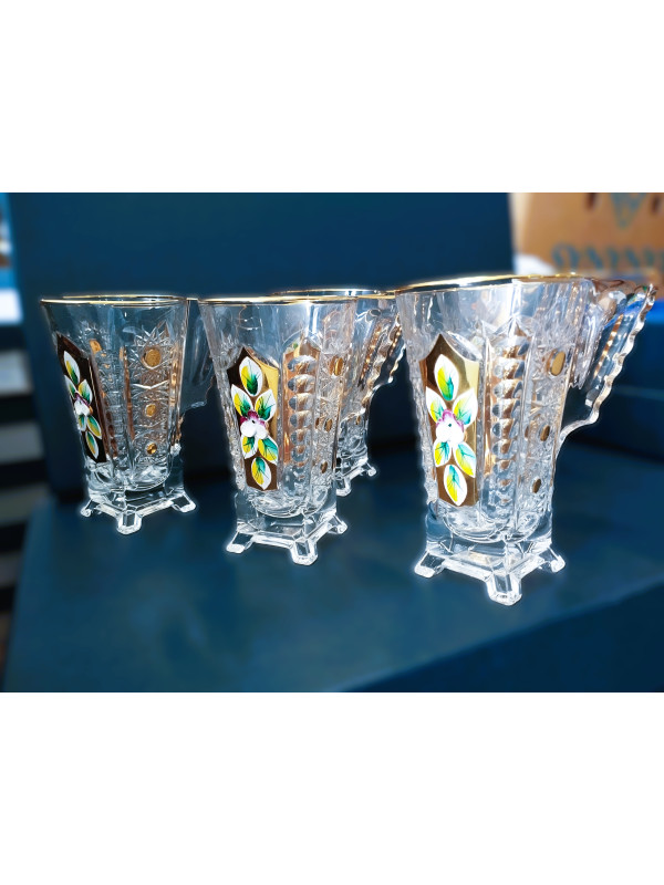 Tazas de té ricamente decoradas con una capacidad de 175 ml. Están decoradas a mano con esmalte y oro. El juego contiene seis tazas. No son aptas para lavavajillas.