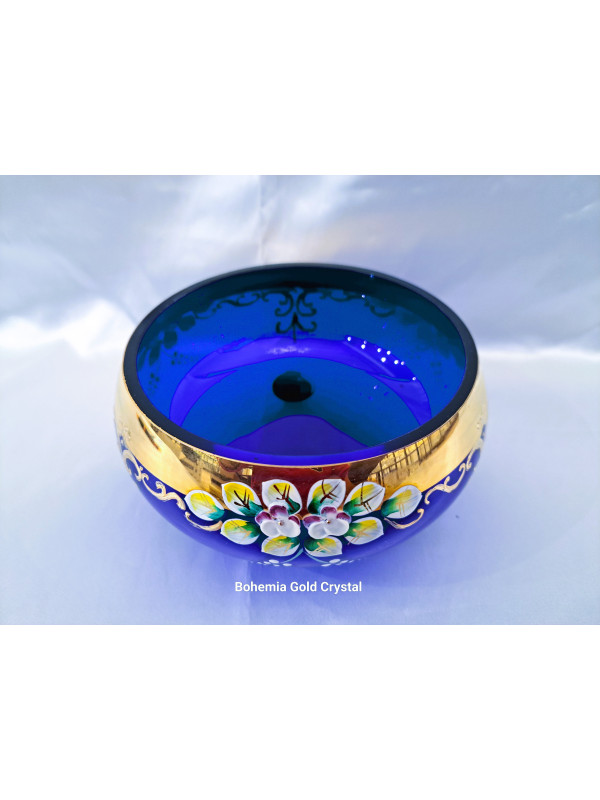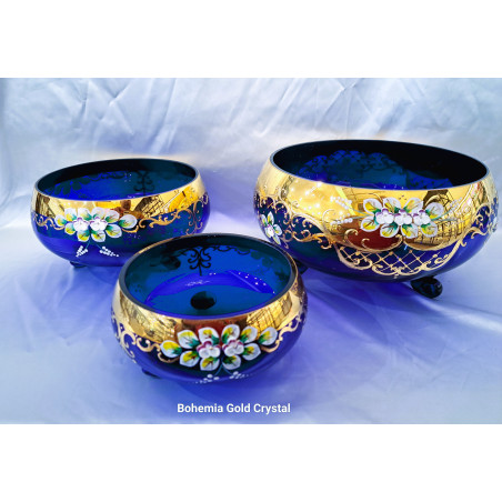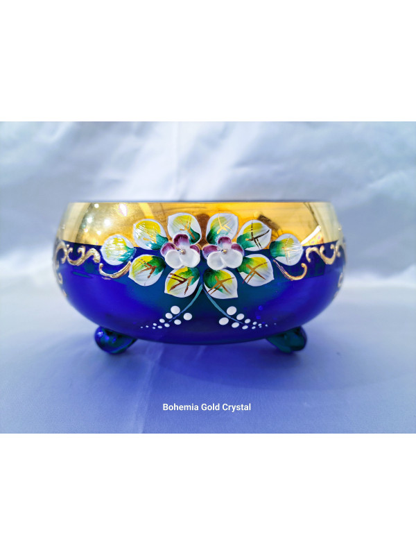 Cuenco azul de tres patas decorado con oro y esmalte. Se trata de una pieza decorada a mano en un taller checo. 3 tamaños en stock. El ancho del cuenco es de 16, 20 o 24 cm.