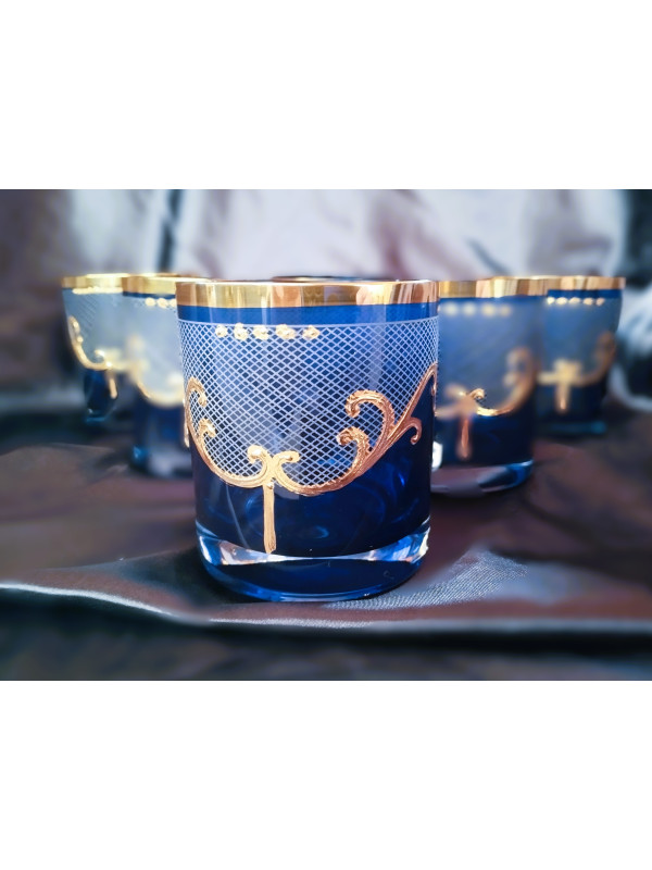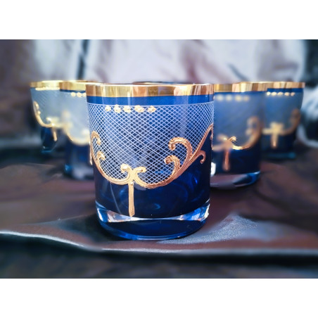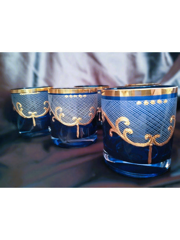 Vasos azules para agua, whisky o zumo con motivos dorados, 320 ml, 6 unidades.