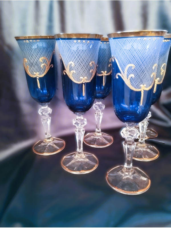 Copas de champán azules con motivo dorado, 150 ml, 6 unidades.