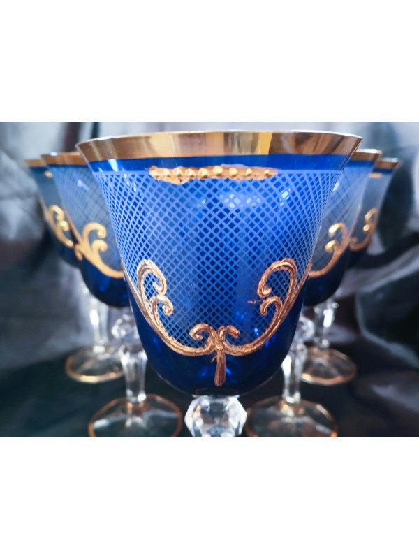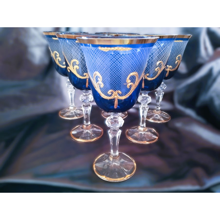 Copas de vino azules con motivo dorado, 220 ml, 6 unidades.