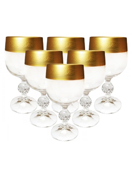 Un juego de seis vasos de la colección Claudia, decorados con color dorado y delicados adornos, con un volumen de 150 ml.