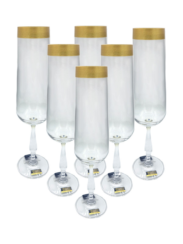 Copa de champán de la colección Scopus con acabado en oro viejo. El volumen del vaso es de 220 ml, el juego contiene 6 piezas. ¡Los vasos no se deben meter en el lavavajillas!
