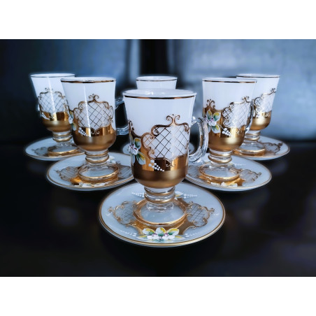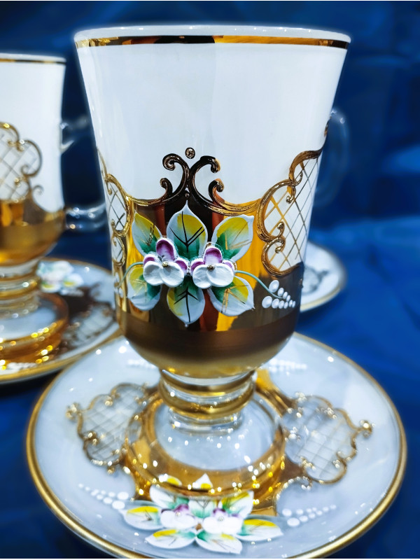 Vasos de té Venezia con platillos blanco, dorado y esmaltado 6 + 6 piezas