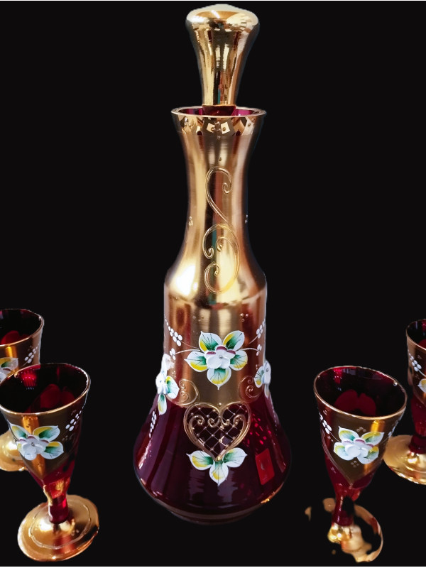 Muy bonito juego de licor decorado con oro. Está hecho a mano y es una pieza verdaderamente original. La altura de la botella incluido el tapón es de 30 cm, la altura de los vasos es de 12 cm. ¡Solo hay un número limitado de piezas disponibles y desaparecerán! Ideal como regalo para los amantes del cristal checo.