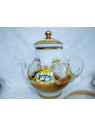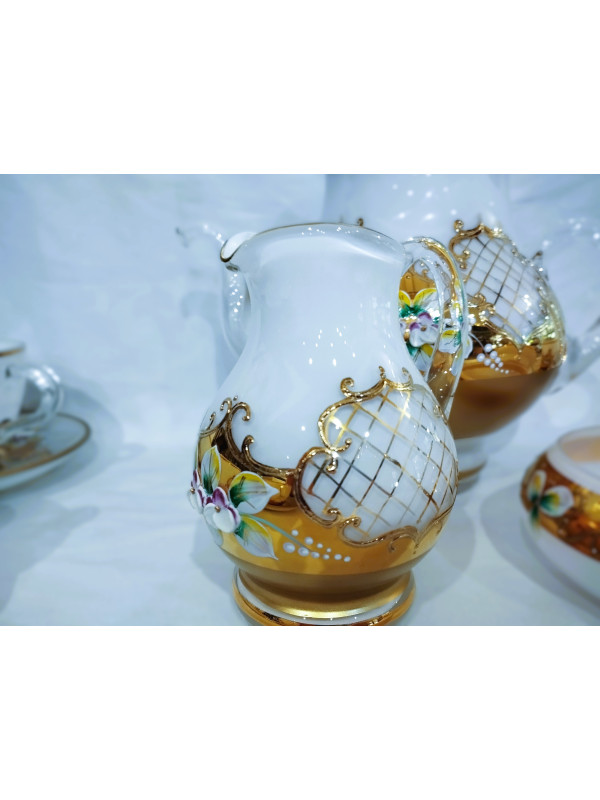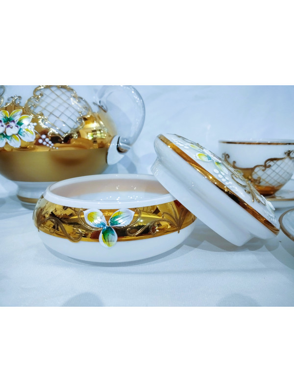 Lujoso juego de té esmaltado en blanco, decorado con oro. El paquete incluye 6 platos, 6 tazas, una tetera, una lechera y un azucarero. Ideal como decoración para una mesa festiva.