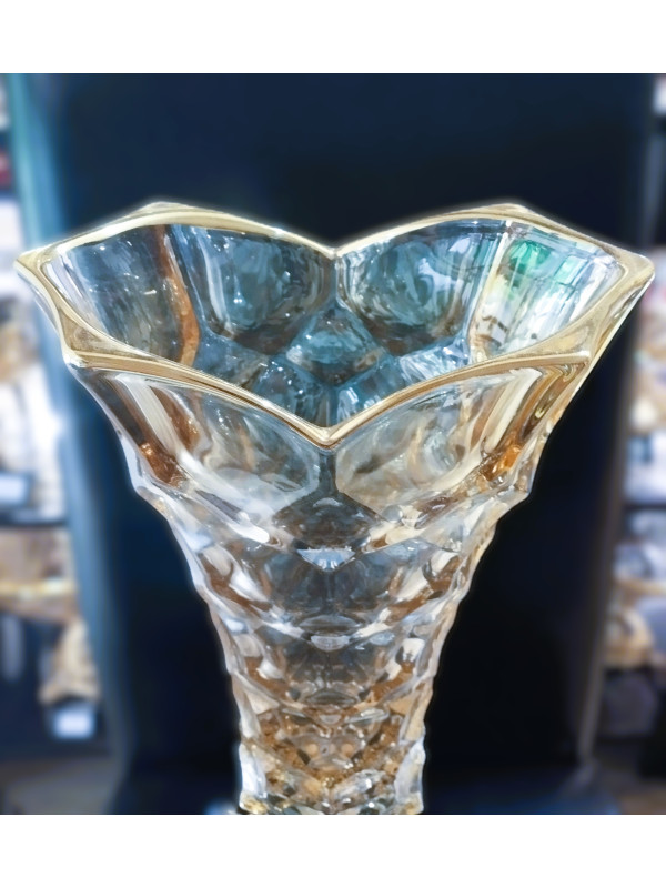 Jarrón de cristal de la colección Honey en color ámbar, con pata de metal italiano, complementado con un borde dorado. Podrás elegir entre una amplia gama de vidrios transparentes o decorados.