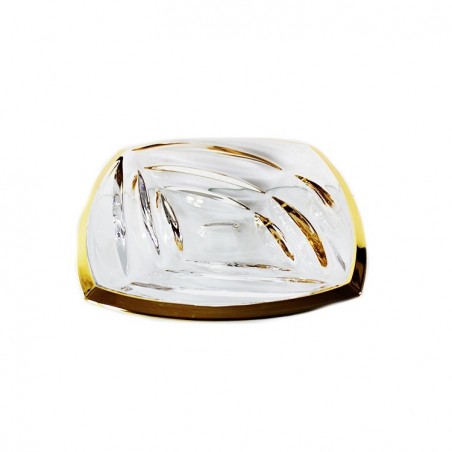 Une plaque de verre cristal sans plomb. Décoré à la main avec 12% d'or. Il fait partie de la collection Facet d'une jante en or, où vous le trouverez également dans une plus grande taille. Convient comme décoration. Poids : 450g Dimensions : 154 x 154 x 23 mm