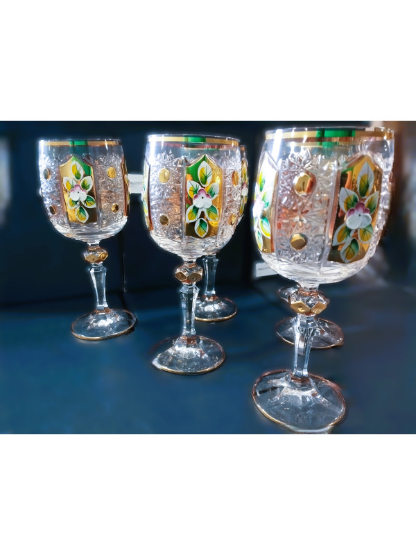 Verres à vin richement décorés dans le décor 57110, particulièrement populaire à l'étranger. Les verres sont décorés à la main avec de l'émail et de l'or.