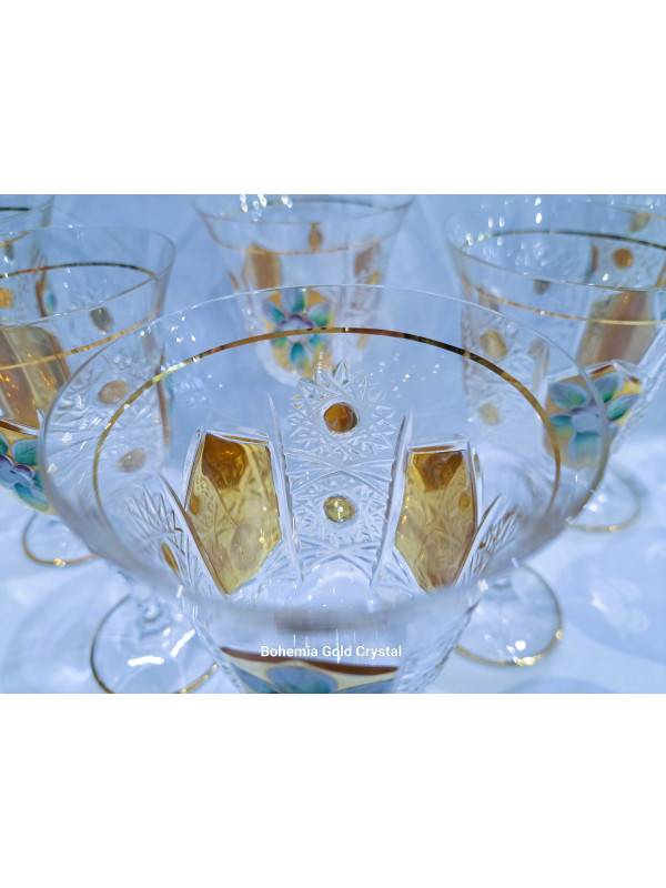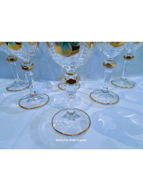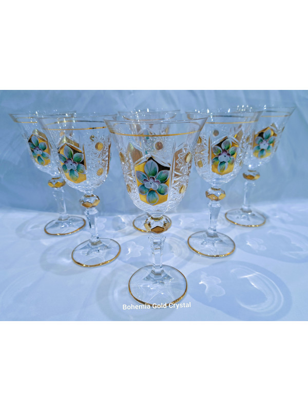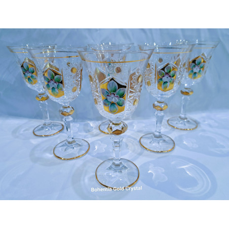 Verres à vin richement décorés dans le décor 57110, particulièrement apprécié à l'étranger. Les verres sont décorés à la main avec de l'émail et de l'or. Le volume est de 170 ml. L'ensemble contient six pièces. Les verres ne sont pas autorisés au lave-vaisselle.