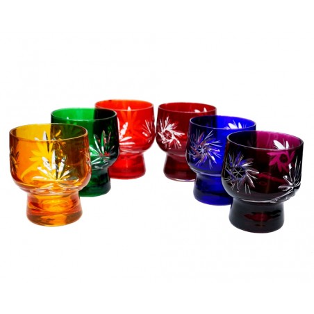 Verres colorés pour liqueurs et spiritueux de la collection Gina, décorés de coupe et de peinture. L'ensemble contient six verres de couleurs différentes. Le volume est d'environ 50 ml.