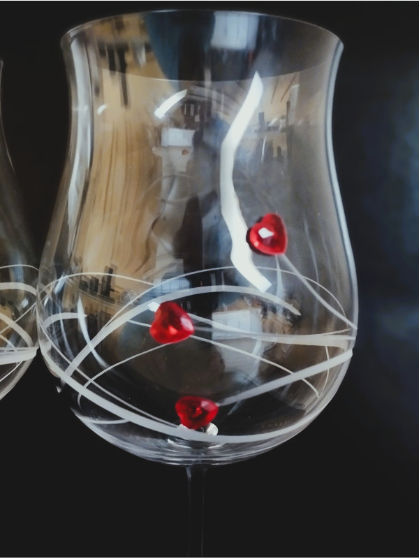 Ensemble de deux verres à vin rouge de la collection Ellen d'un volume de 640 ml, complétés par des cœurs en verre en trois couleurs. L'ensemble est livré dans un coffret cadeau de deux pièces, dans une boîte en satin. Les verres sont fabriqués en cristal sans plomb. Cette collection est très populaire en raison de son utilisation pratique, de son design moderne et de son prix abordable.
