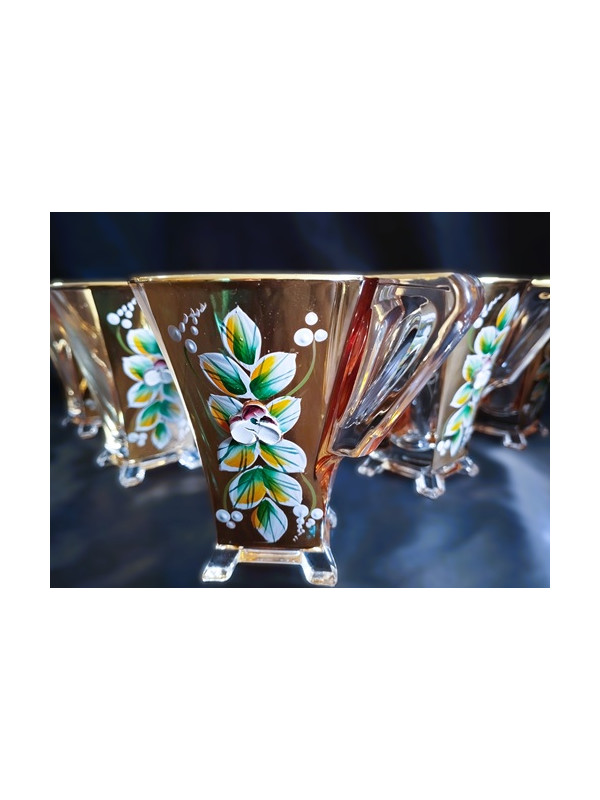 Tasses à thé richement décorées d'une capacité de 150 ml. Décorées à la main d'émail et d'or, elles sont livrées avec un coffret de six tasses. Elles ne passent pas au lave-vaisselle.